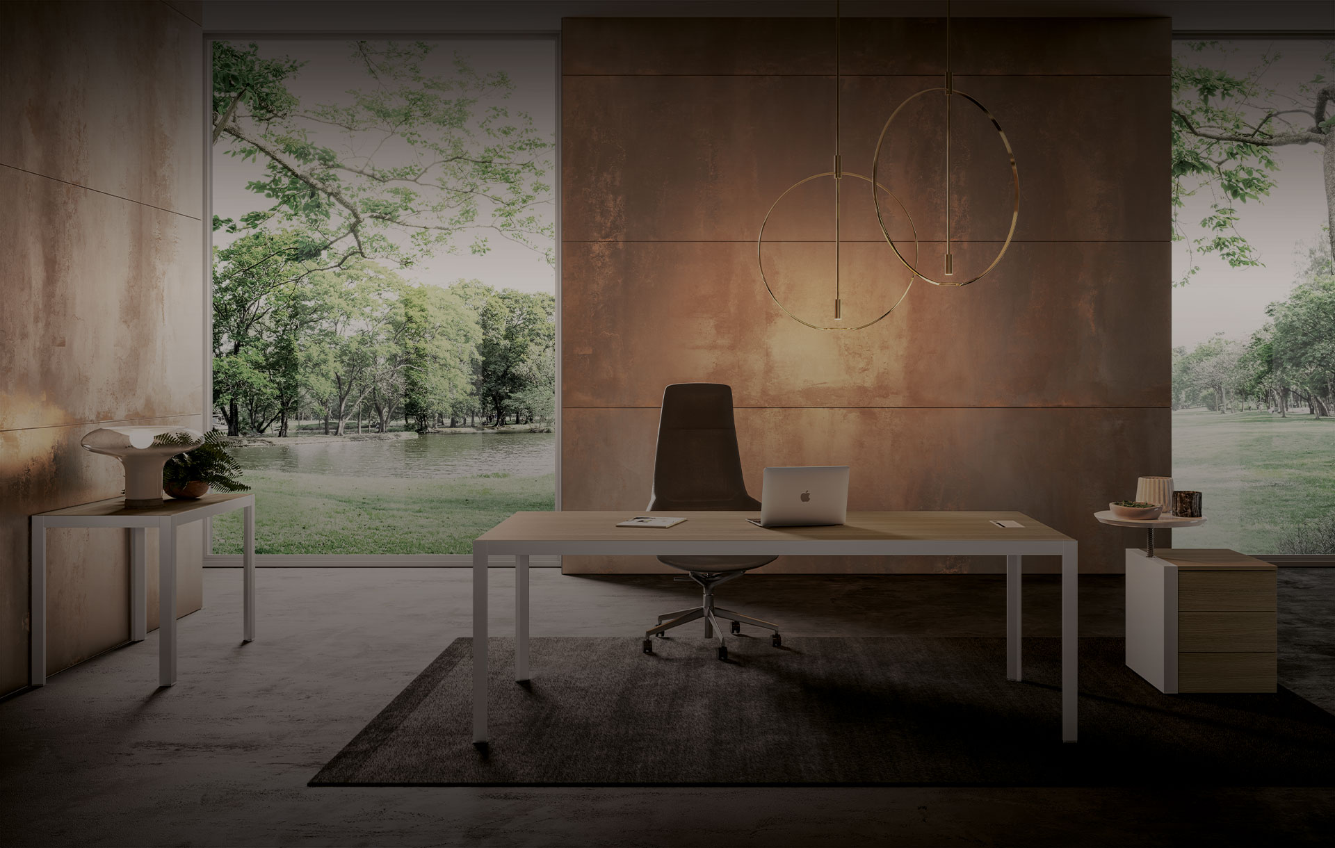 Sale riunioni valorizzate da accostamenti materici unici ma anche audaci, che esaltano la struttura essenziale del design definendo spazi ufficio dall’estetica professionale e contemporanea, e dalla forte presenza scenica.