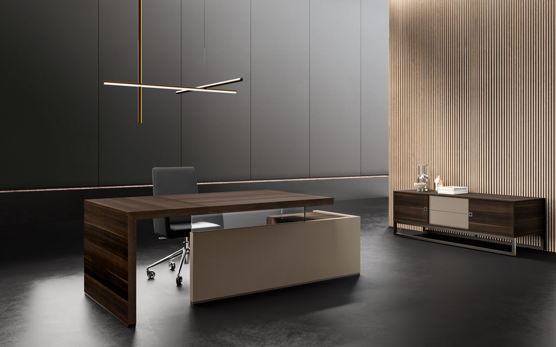 A transparent glass support adds a sense of lightness to the entire composition, highlighting the contrast of finishes. FUSION is designed for those who seek solidity, elegance, and a distinctive furnishing solution for a professional, original office space.
