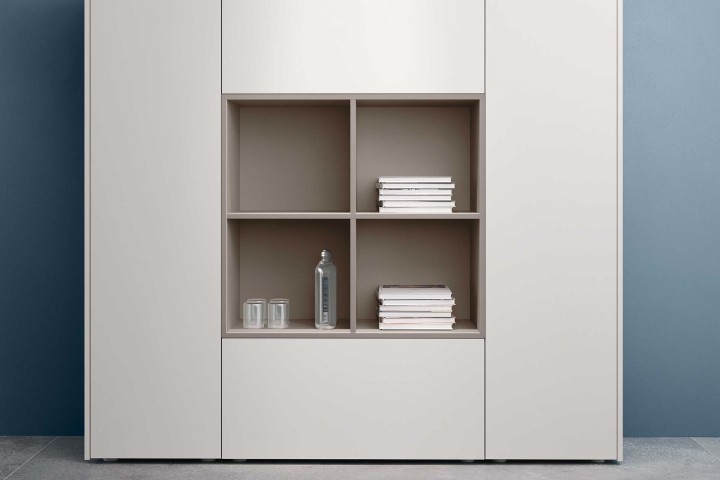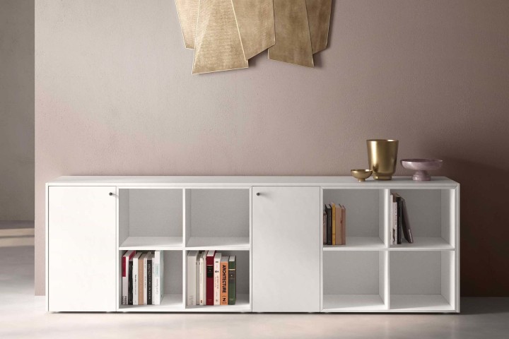 L’estensione compositiva illimitata a qualsiasi dimensione, forma, accostamento cromatico e finitura, si affina per mezzo di quattro tipologie di struttura: Fianco Legno, Gamba K, Gamba Anello e Gamba U.