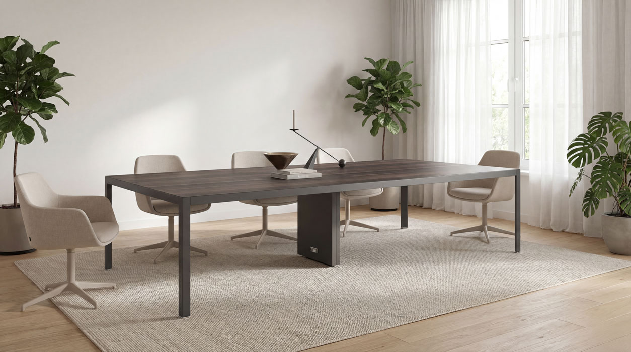 Pensato come fulcro dello spazio meeting e di collaborazione, unisce rigore strutturale e sensibilità materica, dando forma a un arredo solido ma visivamente accogliente.