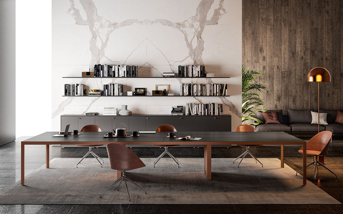 Il tavolo riunione HYPE con piano rivestito in pelle interpreta lo spazio meeting con un linguaggio raffinato e materico.