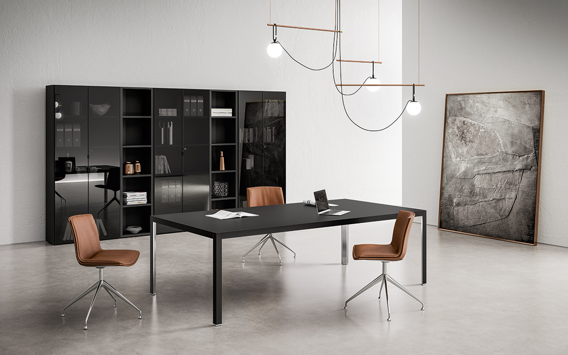 Il tavolo riunione HYPE in vetro laccato NO-PRINT interpreta l’ambiente meeting con un linguaggio formale raffinato e contemporaneo.