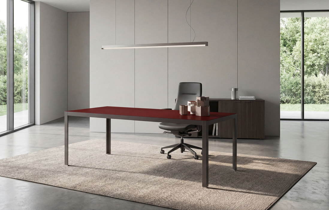 Il vetro si presenta con un finish opaco che attenua i riflessi e dona un’eleganza morbida e impeccabile alla superficie. Questo particolare effetto vellutato non solo esalta la percezione tattile e luminosa della scrivania, ma contribuisce a rendere lo spazio direzionale più sofisticato e armonioso, trasformandolo in un luogo accogliente, professionale e perfettamente in linea con le esigenze contemporanee.
