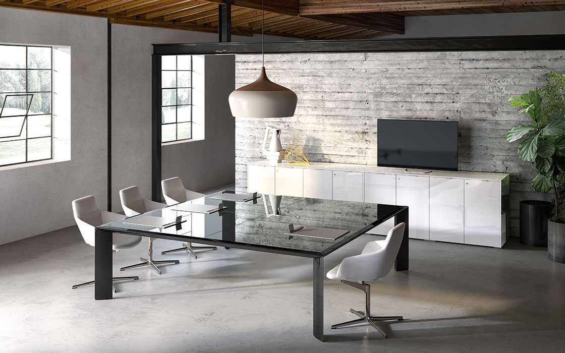 Luminosità e prestigio definiscono il tavolo riunioni KONO con piano in vetro laccato, pensato per qualificare gli spazi decisionali con un’eleganza attuale e distintiva.