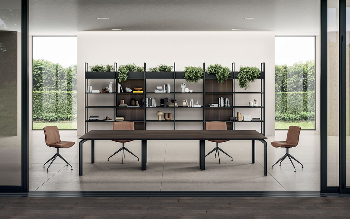 L’ampia proposta di varianti del tavolo riunione, sia per il piano che per la struttura, permette di studiare progetti di office interior estremamente personalizzati. Il tutto completato da arredi di contenimento coordinati nelle finiture e nel design, per ottenere spazi ufficio armoniosi e ricercati.